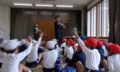 たつの消防署御津出張所を見学しました。映像で消防の仕事を学んだり、消防車に積んである機材の説明を聞いたりしました。