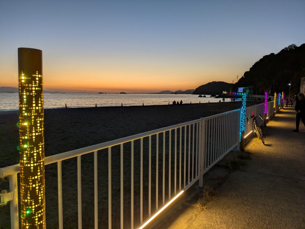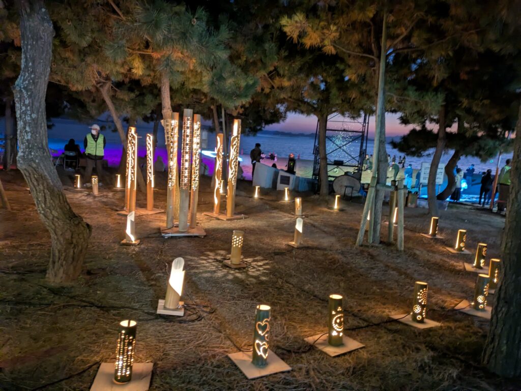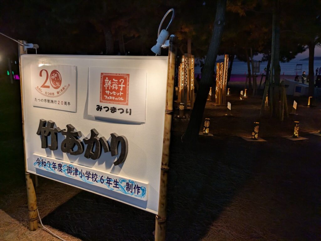 6年生が、たつの市制施行20周年記念イベント『竹あかり』ライトアップ用の竹灯籠制作に参加させていただきました。夕焼けに染まる水平線を背景に、子どもたちが作った幻想的な竹あかりが会場を美しく彩りました。