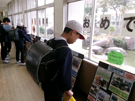 1/7 3学期スタート 学校に、子どもたちの笑顔がもどってきました。気持ちも新たに3学期のスタートです。 始業式。仲間を大切にして、助け合ったり、競い合ったりしながら、みんなでのびる年にしましょう! 明日1月8日は151周年の創立記念日です。「150周年バルーンがつないだともだち校」の千葉県東条小学校も同じく151周年です。友情をこめて、おめでとう! 1年生の絵馬。今年もよい年になりますように・・・