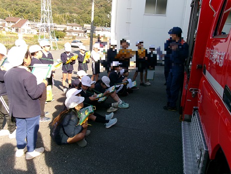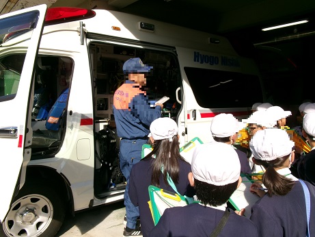 10/30 3年 消防署見学 たつの消防署御津出張所を見学しました。映像で消防の仕事を学んだり、消防車に積んである機材の説明を聞いたりしました。 わたしたちの命をまもってくれる消防士さんはかっこいいなあ。 救急車の中には、いろいろな機材が積んであって、びっくり!