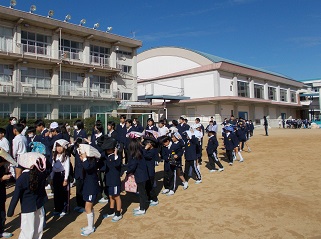 11/6 地震・津波避難訓練 毎年、この時期に行っている津波避難訓練。南海トラフ大地震が発生すると、最大2.3mの津波が120分後に町内一部地域に到達すると想定されています。講話と学級指導では、町内の津波避難ビル2か所と津波避難場所13か所の確認をしました。 地震の避難訓練と同様、運動場にまず避難。 地震避難後、津波警報が発表されたと想定して、3階へ静かに移動。 学級ごとにマニュアルで決められている場所で待機。 放送による講話。自分の住んでいる地区やよく遊ぶ場所の避難場所を確認。