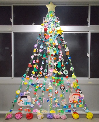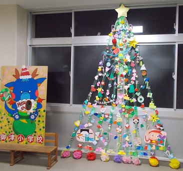 12/23 みつっ子 クリスマスツリー完成! 児童玄関の壁面に、もみの木を模した緑色のテープ飾りをつくりました。子どもたちが持ち寄った折り紙作品をつけると、素敵なクリスマスツリーが完成しました! 飾りがどんどん増えて、いっぱいになりました! みつドラもクリスマス仕様です♡