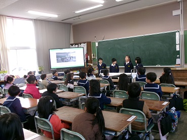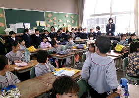 新1年生を教室に招いて交流会を開きました。1年生が、小学校での生活や学習について、写真を見せながら紹介した後、校内を案内して回りました。5年生は、集合場所である体育館から教室までの送迎を担当。新1年をやさしくエスコートしました。