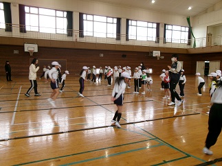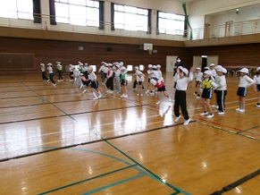 体育館に響く音楽のビートに乗って、1~3年生が「リズムジャンプ」を楽しみました。左右へのステップや体をひねる動きを加えた「ラインジャンプ」に挑戦。少しずつ難易度が上がっていくステップにもすぐに対応し、心地よい汗をかきながらいきいきと活動することができました。