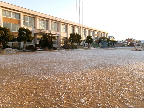 早朝の校庭。登校してきた子どもたちが、うれしそうに雪を集めて遊ぶ姿が見られました。