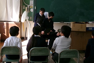 2/17 今年度最後の縦割り活動 行間休みに、異学年グループによる「縦割り遊び」を楽しみました。一年間同じメンバーで続けてきた縦割り活動も今日が最終日。グループのリーダーとして下級生をひっぱってくれた6年生に「ありがとうございました」と感謝を伝えて一年間の活動を終えました。 「イントロ当てクイズ、おもしろかった!」タブレットを使って6年生が準備してくれました。